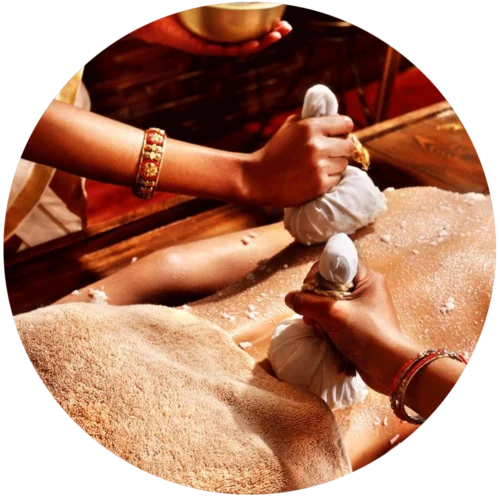 A generous amount of medicated oil is applied over the head and body. Then the body is massaged with a warm muslin bag bolus containing Navara rice puddings cooked in the herbal decoction. The boluses are dipped in the mixture of warm milk and herbal decoctions when they cool down thus inducing sedation.